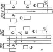 а — рольганг или напольный конвейер; б— подвесной конвейер или монорельс с электроталью.