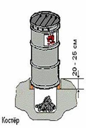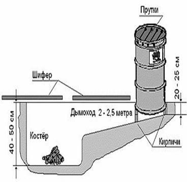 Для цього варіанту коптильні, у бочці необхідно вирізати дно. Викопати яму діаметром під бочку, завглибшки 35 - 40 см. Прокопати канавку-димар, під кутом до вогнища (ямки) в якій буде багаття (рис. 1). Встановити бочку на цеглу, підклавши під неї декілька металевих прутиків, а простір між бочкою і цеглою промазати глиною. Вогнище, бажано викласти каменем або цеглою. При копченні вогнище і димар прикривати металевими або азбоцементними листами.