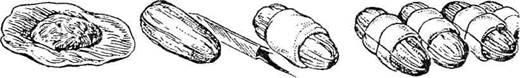 Консистенція : при розрізі має рожевий вигляд , начинка має вигляд , якщо це гриби – сірого кольору , паштет – перемелена печінка з морквою.
