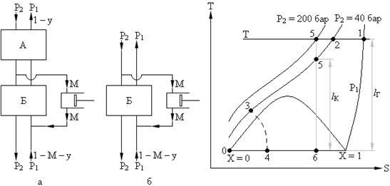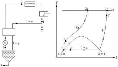 Особенности процессов глубокого охлаждения заключаются в том, что вначале газ сжимают в многоступенчатых компрессорных установках (T ≈ ≈ Const) процесс 1 – 2, затем его охлаждают (P = Const), процесс 2 – 3 и, наконец, дросселируют процесс 3 – 4. Полученный влажный пар сепарируют. Жидкость, как готовый продукт отводят (–y), а паровая фаза (низкопотенциальный поток), имеющая низкую температуру (при P1 = Const) (1 – у), используется для охлаждения высокопотенциального потока (P2 = = Const).