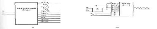 Из таблицы видно, что для воспроизведения функции достаточно использовать мультиплексор «4–1» с дополнительным конъюнктором для получения произведения xlxO. Но при перестройке на другую функцию потребуются и другие функции двух переменных, т.е. универсальный логический модуль должен включать в свой состав дополнительный логический блок (см рис. 2.13, я).