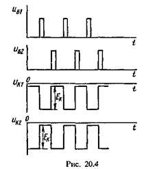 Пусть триггер (рис. 20.4, й) находится в таком устойчивом состоянии, когда транзистор Tt открыт, а транзистор Т2 закрыт. Если на базу открытого транзистора подать запускающий импульс положительной полярности, то за некоторый очень малый промежуток времени транзистор Tt выйдет из режима насыщения и перейдет в активный режим. При этом ток базы, а следовательно, и коллектора транзистора Tt (iKl) уменьшится, что вызовет изменение потенциала коллектора фК1 = uKi = – Ек + ^к1гкь он станет более отрицательным. Отрицательный скачок напряжения на коллекторе вызовет примерно такой же скачок напряжения на базе закрытого транзистора Т2 и под действием изменившегося на его базе напряжения Т2 из режима отсечки перейдет в активный режим. Таким образом, за очень малый промежуток оба транзистора оказываются в активном режиме, в котором они обладают усилительными свойствами.