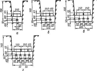 Глибина траншеї повинна бути не менше 700 мм, а -ширина такою, щоб відстань між кількома паралельно прокладеними в лій кабелями напругою до 10 кВ становила не менше 100 мм, Від стінки траншеї до найближчого крайнього кабелю — не менше 56 мм (рис. 1.3, а—г).
