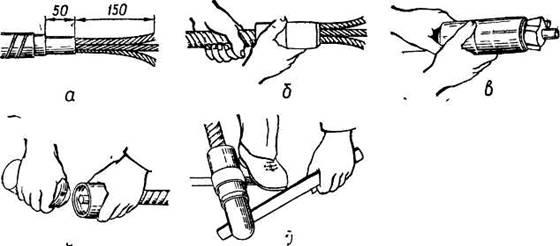 Потім розкручують і знімають з оболонки кабельну пряжу і захисне покриття з паперу або полівінілхлориду (рис. 2.3, є).