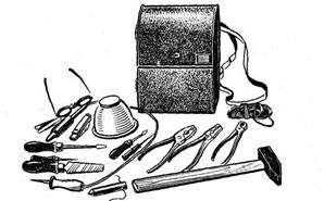 Заводи випускають набори інструменту для виконання окремих видів електротехнічних робіт. Так, до комплекту інструменту (рис. 3.1.) для виконання електромонтажних робіт загального призначення входять: плоскогубці 200 мм універсальні, плоскогубці електромонтажні з еластичними чохлами; гострогубці (кусачки) 150 мм з еластичними чохлами, викрутки слюсарно-монтажні різні (з пластмасовими ручками) — 3 шт.; молоток слюсарний з ручкою масою 0,8 кг; ніж монтерський; шило монтерське; покажчик напруги; лінійка метрова складана металева; окуляри захисні світлі; гіпсівка; гладилка; шнур кручений діаметром 1,5—2 мм і довжиною 15 м.