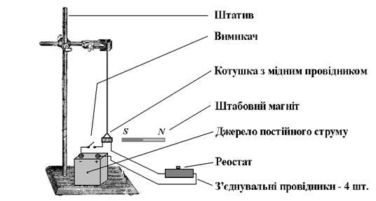 Електросхема складається: з джерела струму, двох котушок знижувального трансформатора, реостата, амперметра, вольтметра, двох вимикачів і 7 з’єднувальних металевих провідників.