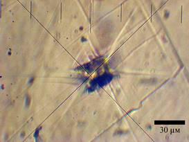| Рис.1. Ансамбль клиновидных двойников заклинившихся у отпечатка индентора без воздействия МП |