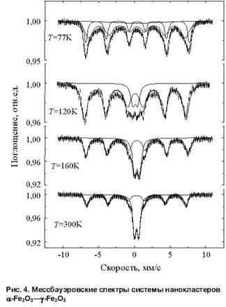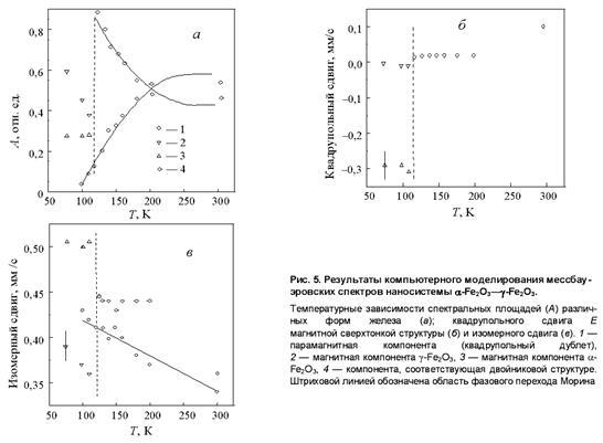 В мессбауэровских спектрах фазовый переход "коллинеарность – неколлинеарность магнитных моментов" с поворотом направления спинов относительно направления градиента кристаллического поля определяется по изменению знака и величины квадрупольного расщепления спектра , обладающего магнитной сверхтонкой структурой. Так, для массивного образца высокотемпературной фазе соответствует мм/с, а низкотемпературной мм/с. Особенности этого фазового перехода в наносистеме и прослеживаются из рис. 5б. Низкотемпературная фаза ( мм/с), обладающая при коллинеарным антиферромагнетизмом, при переходит в состояние неколлинеарного антиферромагнетизма с мм/с (высокотемпературная фаза). Таким образом температура перехода Морина наносистемы по сравнению с поведением массивного материала понижается до 120 К , причем высокотемпературная фаза имеет меньшее значение , чем характерное для массивного материала. С уменьшением размера кластера обменная энергия уменьшается (понижается ) и вероятность существования неколлинеарного антиферромагнетизма возрастает.