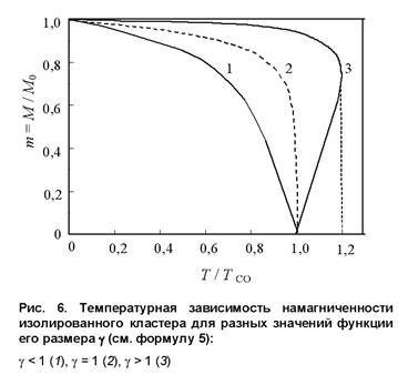 Как видно из рис.6, уменьшение намагниченности с ростом температуры происходит по-разному в зависимости от размера кластера ( функции). Если размер кластера так велик, что значение , то зависимость однозначна и описывает переход второго рода. Если же кластер настолько мал, что , то зависимость приобретает Z-образную форму. В этом случае при понижении температуры переход на нижнююветвь зависимости будет происходить скачко (см. пунктир на рис. 3), что характерно для фазовых переходов первого рода. Если обозначить температуру перехода, при которой происходит изменение типа фазовогоперехода, , т.е. полагать , то критический размер кластера, характерный для данной температуры, может быть рассчитан по формуле