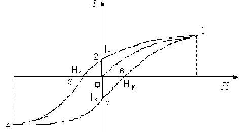 Нехай намагнічування феромагнетика до насичення (точка 1 на рис. 14.7) відбувається по кривій 01. Якщо далі зменшувати напруженість Н зовнішнього намагнічувального поля, то як показує дослід, розмагнічування феромагнетика відбуватиметься за кривою 1-2, розміщеної вище кривої намагнічування. Якщо напруженість намагнічувального поля досягне нуля Н=0, у феромагнетику спостерігається деяке залишкове намагнічування Із