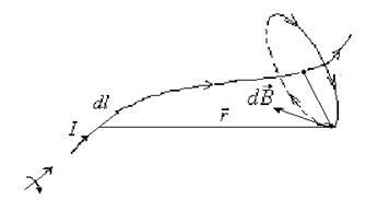 де кут - це кут між напрямком елемента провідника із струмом і радіусом-вектором , як це показано на рис.11.4; - дотичний вектор до силової лінії, напрям якого збігаються з напрямком обертання правого гвинта.
