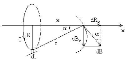 Елемент провідника із струмом dl, створює на осі x індукцію магнітного поля dB. Вектор є дотичним до силової лінії, зображеної на рисунку пунктирною лінією. Складова вектора індукції магнітного поля dBy