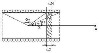 Виділений елемент соленоїда шириною dx, в якому dN витків, що щільно прилягають один до одного, можна розглянути як круговий виток, індукція якого розраховується за формулою (11.2.15)
