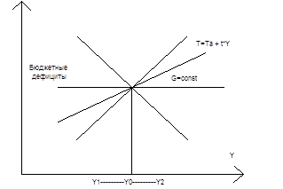 Пояснения: В фазе циклического подъема совокупный доход увеличивается (Y2 > Y0), и поэтому налоговые отчисления автоматически возрастают, а трансфертные платежи автоматически снижаются.