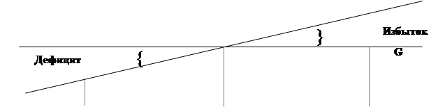 Величины циклических дефицитов (излишков) определяются степенью "крутизны" графиков налоговой и бюджетной функций. Угол наклона налоговой функции T определяется величиной предельной налоговой ставки t, а угол наклона функции государственных расходов G - величиной, которая характеризует соотношение между изменением суммы получаемого трансферта и изменением величины дохода. Чем выше уровень дохода, тем выше вносимый налог и ниже трансферт, получаемый от государства.