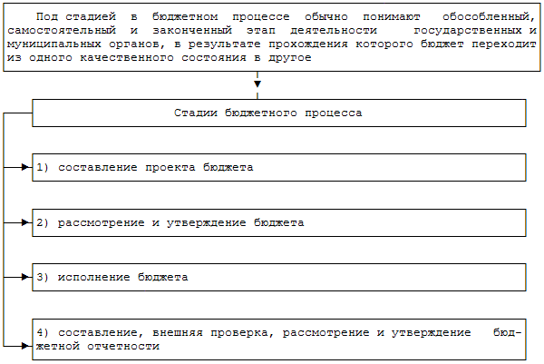 Бюджетный процесс - регламентируемая нормами права деятельность органов государственной власти, органов местного самоуправления и участников бюджетного процесса по составлению и рассмотрению проектов бюджетов, проектов бюджетов государственных внебюджетных фондов, утверждению и исполнению бюджетов и бюджетов государственных внебюджетных фондов, а также по контролю за их исполнением.