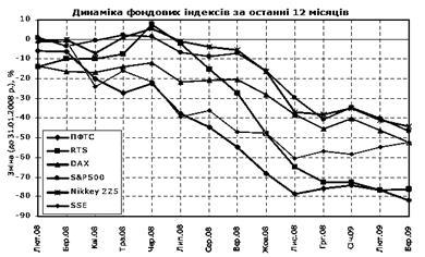 Рис. 3.1. Динаміка фондових індексів за останні 12 місяців.