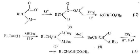 Алкилмалоновые кислоты с хорошим выходом {схема (10)} получают при реакции алюминийлитиевого производного карбоновой кислоты (2) с диоксидом углерода [9]; в свою очередь, металлорганпческое производное (2), используемое в этой реакции, получают гидроалюминированием алкинов-1. Например, гексин-1 при взаимодействии с 2 моль диизобутилалюминийгидрида приводит (с 85%-ным выходом) к металлорганическому производному (3) {схема (11)}, которое после обработки метиллитием дает (4). Это соединение реагирует с диоксидом углерода с образованием малоновой кислоты, причем, как показано на схеме (10), реакция идет через образование интермедиата (2).