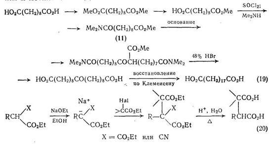 Алкилирование анионов, получаемых из эфиров малоновой кислоты или этилцианоацетата, широко используется для синтеза монокарбоновых кислот, и как видно из схемы (20), может также применяться для получения дикарбоновых кислот. При использовании в качестве алкилирующих агентов соответствующих сложных эфиров галогенокислот {схема (20)} этот метод в принципе может позволить получать различные ди- и поликарбоновые кислоты.