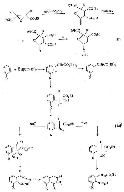 Дегидробензолы реагируют с малоновыми эфирами, давая производные гомофталевой кислоты. Например, реакция диэтилмалоната с о