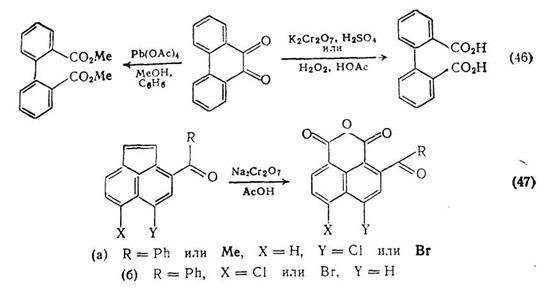 Окисление фенантрахшюна {схема (46)} служит удобным методом синтеза как бифенил-2,2'-дикарбоновой кислоты так и ее диметилового эфира. Окисление различных ацилгалогенаценафтенов приводит к соответствующим нафталиновым аи гидридам, хотя существуют заметные различия в легкости образования ангидридов {схема (47)}.