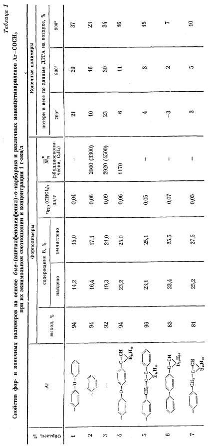 , характеризующей концевые ацетильные группы, значительно ниже, чем у полимеров на основе диацетил-ароматических соединений без карборановых ядер, что свидетельствует о незначительном количестве этих групп.