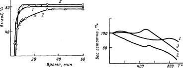 Выше 400° деструкция замедляется и в целом при 800—900° коксовый остаток составляет 90%. Выше 250° характер кривой 2 (рис. 2), относящейся к форполимеру на основе АФОК, в определенной степени близок характеру кривой 1, при этом потери в весе до 400° (20%) обусловлены, вероятно, конденсацией или частичной деструкцией ацетильных групп. При температурах выше 400 ° для полимеров полифениленового типа (рис. 2, кривые 2, 3), как и для других классов полимеров [9], характерен привес, в данном случае небольшой, связанный с окислением карборанового ядра. В целом потери в весе полимеров тем меньше, чем выше содержание бора в исходном форполимере, т. е. для тех полимеров, где карборановое ядро содержится одновременно в нефункциональном и монофункциональном исходном мономере (табл. 1).