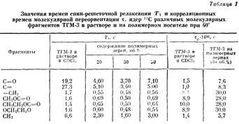 C ТГМ-3, адсорбированного полимерными зернами (30 об.% полимера) после частичной релаксации в процессе измерения 7Л методом инверсии — восстановления. На спектрах указаны значения т и отнесение сигналов, выполненное на основании литературных данных [6]. Как видно из рис. 1, а также из табл. 1, ТГМ-3 на твердом носителе имеет резко уменьшенное значение 7\ для всех ядер углерода, что можно объяснить увеличением корреляционного времени тс
