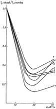 Зависимость соотношений величин 7 олигомера наполимерном носителе и в растворе имеет четко выраженный минимум при 25—30 об.% полимера (рис. 2). Аналогичная экстремальная зависимость с минимумом молекулярной подвижности, обнаруженная при адсорбции эпоксидной смолы, описана в работе [2].