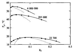 Рис. 6. Фазовые диаграммы для трех фракций полиизобутилена в диизобутилкетоне. Сплошные кривые проведены через экспериментальные точки, пунктирные кривые — теоретические