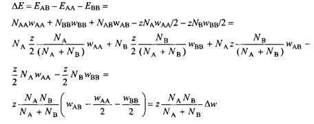 Видно, что в уравнение входит только величина Днн, и результат в неявном виде зависит от параметров индивидуальных взаимодействий waa, wbb и wab- Изменение взаимодействий при смешении, очевидно, может быть как положительным, так и отрицательным. Знак изменения зависит от того, является ли взаимодействие АВ более положительным по сравнению с усредненными взаимодействиями А А и ВВ.