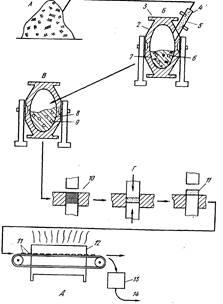 Форма для прессования 11 изготавливается с соответствующим допуском на усадку продукта прессования. Величина усадки может контролироваться в пределах 0—15 %. Форма для прессования // подается в печь 12 для спекания, где нагревается при высокой температуре, например в случае криогенного порошка на основе железа до 1100—1150 °С. Температура, до которой нагревается порошок, должна по меньшей мере находиться в области пластичности металлических компонентов порошка (обычно нагревание проводят до температуры спекания). В печи желательно создавать защитную атмосферу, используя для этой цели инертные газы или газы-восстановители.