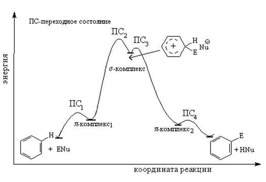 В p-комплексе p-электронная система бензола выступает как донор электронов, а электрофильный агент действует как акцептор электронов. Однако образование и диссоциация p-комплекса происходят очень быстро, и образование p-комплекса в большинстве случаев не оказывает существенного влияния ни на скорость реакции, ни на природу подавляющего большинства образующихся соединений.