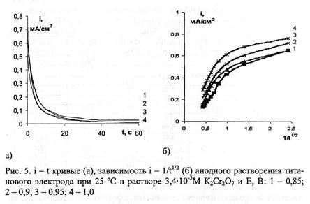 Характер i - 1 - кривых позволяет проанализировать начальные участки спада тока в координатах i - 1/V7, с целью выяснения лимитирующей стадии процесса. То, что в начальный момент поляризации (1 - 1,5 с) зависимости i - 1/V7 не идут в начало координат, свидетельствует о протекании на границе раздела фаз электрод - раствор К2Сг207 гетерогенной химической реакции. Такой реакцией может быть конкурирующая адсорбция бихромат-ионов, молекул воды и продуктов взаимодействия бихромат-ионов с поверхностью электрода. На поверхности стального электрода в области потенциалов от 0,2 В до 0,75 В возможно протекание реакций, связанных с переходом железа в оксидное и гидроксидное состояния.