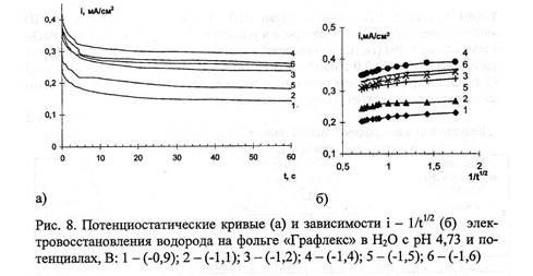 Накопление продуктов катодной реакции на поверхности фольги "Графлекс": хромихроматная пленка, водород, продукты окисления графита должно привести с течением времени к уменьшению скорости процесса. Схему катодного процесса в хромовокислом электролите можно представить совокупностью реакций: