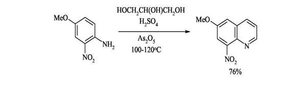 По методу Скраупа ароматический амин, по меньшей мере с одним свободным орто-положением по отношению к амино группе, нагревается с глицерином, серной кислотой (которая действует как дегидратирующий агент и катализатор) и окислителем. В простейшем случае, когда в качестве амина взят анилин, а в качестве окислителя-нитробензол, реакцию можно изобразить следующей схемой: