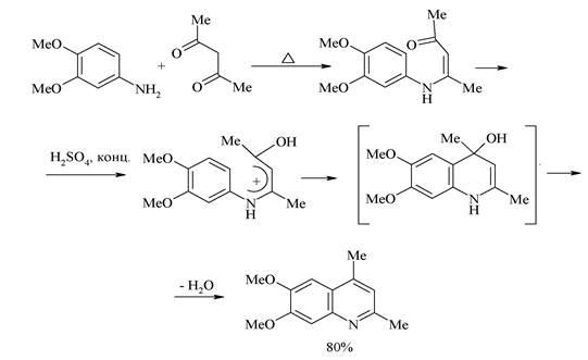 Конденсация 1,3-дикарбонильного соединения с ароматическим амином даёт с высоким выходом β-аминоенон, который циклизуется под действием концентрированной кислоты. Эта стадия представляет собой электрофильное замещение мезомерного О-протонированного аминоенона, а последующее отщепление молекулы воды приводит к образованию ароматического хинолина.