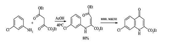 Этот близкий предыдущему метод основан на конденсации ариламинов с β-кетоэфирами и приводит к хинолонам. В кетоэфирах имеются карбонильные группы двух типов и аминогруппа ароматических аминов конденсируется с наиболее активной карбонильной группой кетона. Полученный β-аминоакриловый эфир при 250 С циклизуется в 4-хинолон.