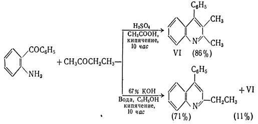 Хинолины можно получить конденсацией орто-ациланилинов с кетонами или альдегидами(последние должны содержать α-метиленовуюгруппу), катализируемой кислотами или щелочами. Формально такого типа конденсация заключается в образовании основания Шиффа и последующей конденсации альдольного типа с участием арильного карбонила и активной метиленовой группы.