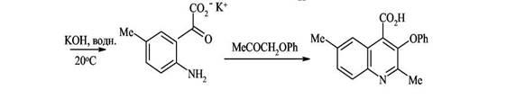 Предыдущий синтез основан на применении малодоступных орто-бензальдегидов, и в этом варианте метода Фридлендера вместо них используют гораздо более доступные замещённые изатины.