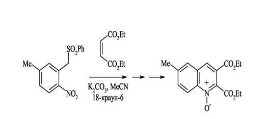 Исходные орто-нитробензиларилсульфоны очень удобно получать по реакции викариозного нуклеофильного замещения. Наличие в исходных структурах сульфонильной группы, обладающей способностью легко элиминироваться в виде арилсульфоновой кислоты, позволяет сразу получать ароматические структуры, не прибегая к дополнительному окислению. Процесс идет через несколько стадий и завершается образованием N-оксида 2,3-ди(этоксикарбонил)хинолина.