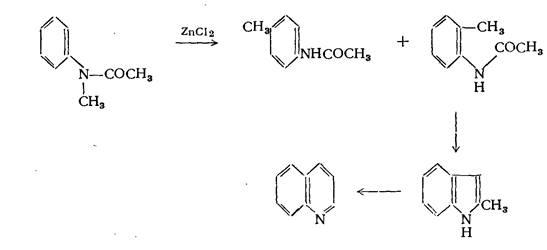 частично в орто- и частично в пара-положение. N-ацетилметиланилин в аналогичной реакции даёт хинолин. Образование хинолина в этой реакции нельзя объяснить таким же образом, как и образование хинальдина в приведённой выше реакции. Было высказано предположение, что образование хинолина может происходить через стадию получения 2-метилиндола.