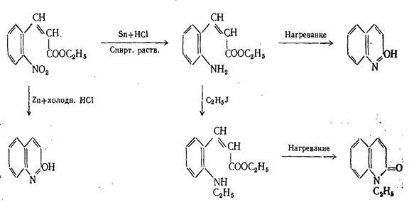 Это одна из первых известных реакций замыкания хинолинового цикла, которая заключается в образовании карбостирила при восстановлении о-нитрокоричной кислоты: