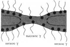 Рис. 3. При растяжении пенной пленки вследствие механических вибраций или термической нестабильности поверхностная концентрация поверхностно-активного вещества в месте растяжения внезапно понижается, вызывая тем самым увеличение поверхностного натяжения и восстанавливающую силу