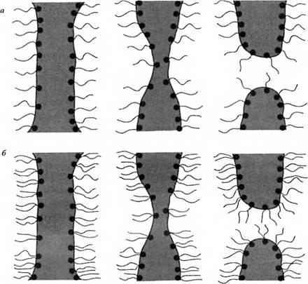 Рис. 11. Согласно общепринятому механизму пеногашения, пеногаситель растекается по поверхности пенной пленки и выталкивает из нее слой жидкости, вызывая утончение пленки вплоть до ее разрыва