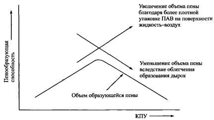 Рис. 6. По мере изменения КПУ в пене проявляются два противоположно действующих эффекта, вследствие чего при некотором значении КПУ пенообразующая способность имеет максимум