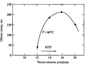 Величину КПУ ионных ПАВ можно варьировать изменением длины углеводородных цепей. На этом рисунке представлена зависимость объема пены, полученной из водных растворов алкилсульфатов при 60 °С, от числа атомов углерода в алкильной цепи. Максимальный объем пены получается в случае алкилсульфата, содержащего в алкильной цепи 16 атомов углерода. Для ПАВ с более короткими алкильными цепями уменьшение пенообразующей способности преимущественно определяется нарушением когезии между монослоями ПАВ. Тогда как в случае ПАВ с более длинными алкильными цепями разрушение пены происходит по механизму образования дырок. Опыты проводились при температуре 60 °С, чтобы все системы находились заведомо выше точки Крафта.