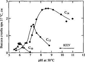 Значения КПУ систем, содержащих анионные ПАВ, чувствительны также к добавкам неионных длинноцепочечных дифильных веществ - жирных кислот и спиртов. Эти вещества увеличивают значение КПУ системы в целом, что приводит к увеличению пенообразующей способности по сравнению с исходной системой с небольшими значениями КПУ. Видно, что пенообразование при стабилизации водными растворами мыл зависит от рН. При высоких значениях рН жирные кислоты диссоциированы. При этом образуются мыла с низкими значениями КПУ, что сопровождается снижением пенообразующей способности из-за нарушения когезии монослоев ПАВ в пенных пленках. При низких рН, когда ПАВ представлено в основном недиссоциированными жирными кислотами, пенообразующая способность также невелика. Но в этом случае повышается вероятность возникновения дырок из-за больших значений КПУ. Максимальная пенообразующая способность сдвигается в сторону больших значений рН для длинных алкильных цепей. При удлинении алкильной цепи значение КПУ увеличивается, и для баланса двух указанных сил требуются ПАВ с большим зарядом.