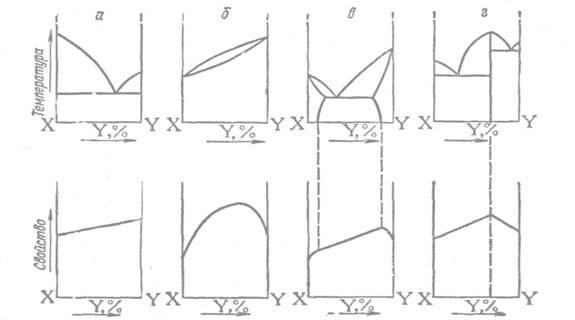 При вивченні властивостей сплавів велике значення мають діаграми стану, які характеризують стан сплаву різного складу від температури. такі діаграми показують термодинамічно стійкі стани, які відповідають максимуму енергії Гіббса системи. Їх також називають фазовими діаграмами, оскільки вони показують, які фази можуть існувати за даних умов. Діаграми стану одержують експериментальним шляхом. Але вони не показують змін властивостей сплавів від зміни їх складу чи температури, тому М. С. Курнаков модифікував їх і створив діаграми „склад-властивість”. На таких діаграмах по осі абсцис відкладають, як і на діаграмі стану, склад системи, а по осі ординат – величини, що характеризують різноманітні властивості системи: густину, електропровідність, корозійну стійкість. Зразок діаграм „склад-властивість” наведено на рисунку 2. В верхній частині зображені діаграми стану чотирьох основних типів сплавів, а в нижній його частині – відповідні типові діаграми „склад-властивості”. Взагалі існує чотири типи сплавів: