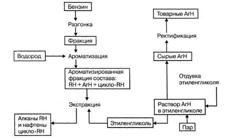 2 Полученные ароматические углеводороды выделяются из ароматизированных фракций экстракцией этиленгликолем или диэтиленгликолем, в которых не растворяются алканы и нафтены.